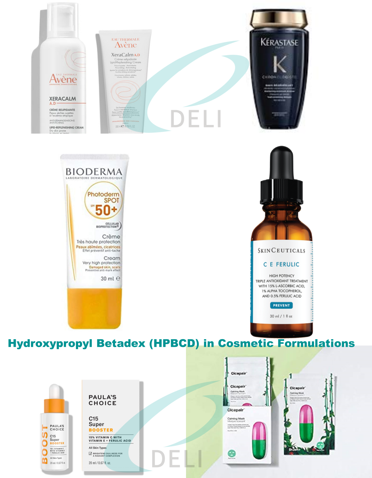 वर्तमान में, कई कॉस्मेटिक और स्किन केयर ब्रांड सार्वजनिक रूप से विशिष्ट अवयवों (जैसे, हाइड्रॉक्सीप्रोपाइल Betacyclodextrin, HPBCD) का उपयोग करते हुए उनके योगों में उपयोग नहीं करते हैं, जिससे HPBCD का उपयोग करने वाले विशिष्ट उत्पादों को निश्चित रूप से सूचीबद्ध करना अधिक कठिन हो जाता है। हालांकि, सार्वजनिक रूप से उपलब्ध साहित्य, पेटेंट और उद्योग स्रोतों के आधार पर, निम्नलिखित कुछ स्पष्ट या अत्यधिक संभावित श्रेणियां हैं और सौंदर्य प्रसाधन और त्वचा देखभाल उत्पादों के उदाहरण हैं जो एचपीबीसीडी का उपयोग करते हैं: