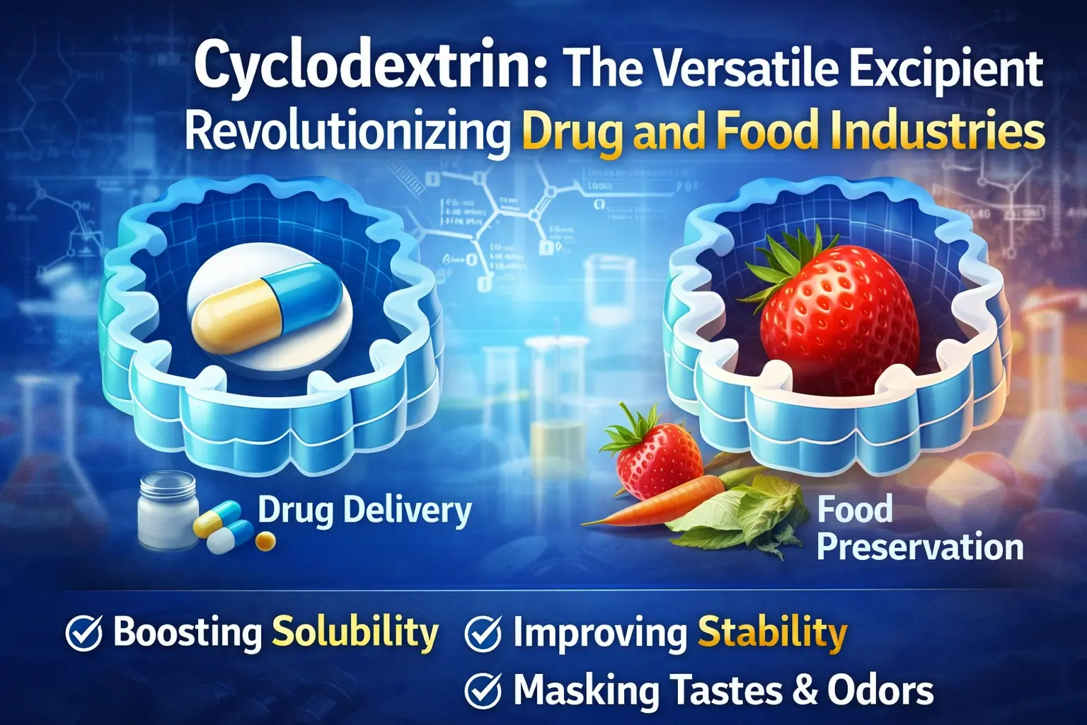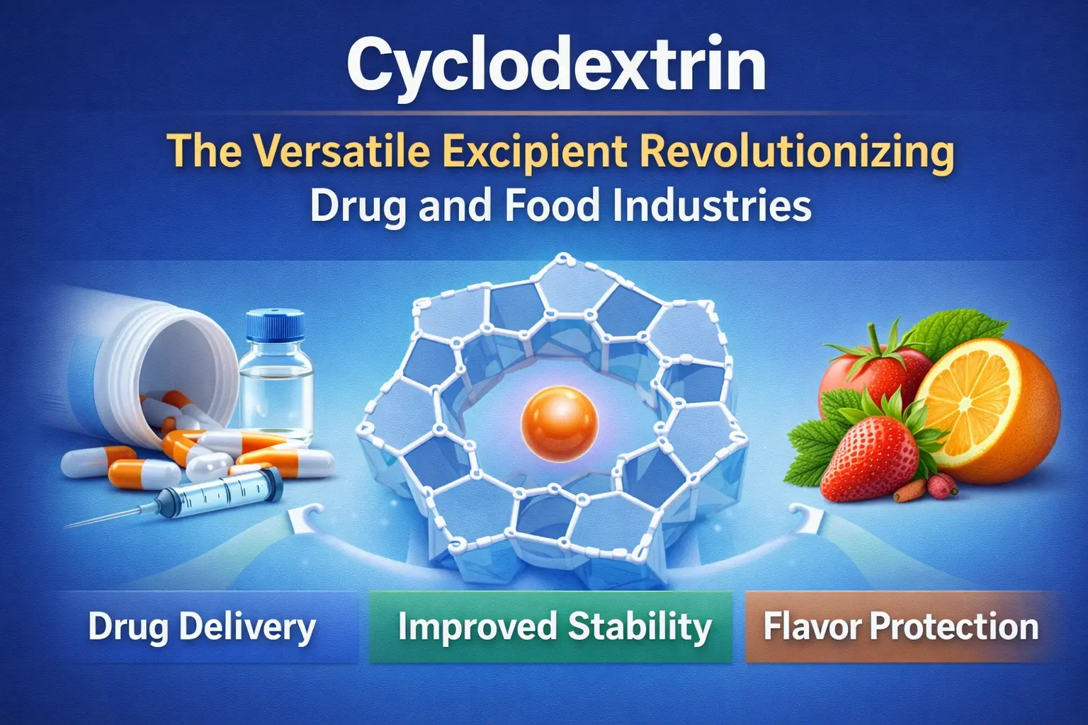 साइक्लोडेक्सट्रिन की खोज भोजन और चिकित्सा के इतिहास में सबसे महत्वपूर्ण कदमों में से एक है। प्राकृतिक रूप से पाए जाने वाले इस चक्रीय ऑलिगोसेकेराइड ने हमारे दवा वितरण, भोजन को ताज़ा रखने और उद्योग में कई अन्य रसायनों के उपयोग के तरीके को बदल दिया है। प्रुडक्ट समावेशन कॉम्प्लेक्स बनाता है जो अपनी विशिष्ट आणविक संरचना के कारण कई क्षेत्रों में महत्वपूर्ण समस्याओं का समाधान करता है, जिसमें एक हाइड्रोफोबिक आंतरिक गुहा और एक हाइड्रोफिलिक बाहरी सतह होती है। यह लचीला एक्सीपिएंट पूरी दुनिया में फॉर्मूलेशन विज्ञान और विनिर्माण प्रक्रियाओं को बदल रहा है। यह दवा के अवशोषण में सुधार से लेकर दवाओं में खराब स्वाद को छिपाने तक सब कुछ कर सकता है।