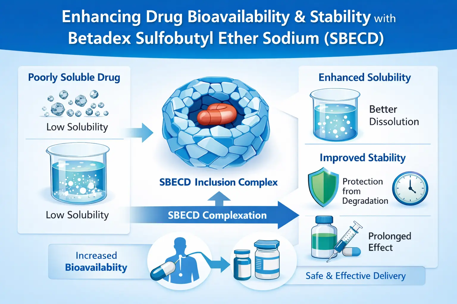 शोधकर्ताओं ने पाया है कि एसबीईसीडी कॉम्प्लेक्सेशन हाइड्रोफोबिक दवाओं को बहुत बेहतर तरीके से घुलने योग्य बना सकता है। बेहतर घुलनशीलता सीधे तौर पर बेहतर जैवउपलब्धता की ओर ले जाती है, विशेष रूप से पैरेंट्रल रूपों में जहां दवा को पूरी तरह से घुलने की आवश्यकता होती है।